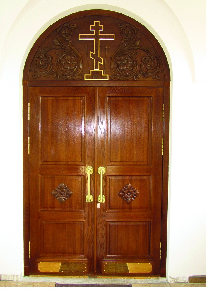 Дверь двухстворчатая. Размеры: 1500 х 2100 мм. Фрамуга: 1500 х 700 мм. Материал: массив дуба, резьба, частичное золочение. Ручки: латунь, литье, Накладки латунь. Возможно изготовление по индивидуальным размерам.