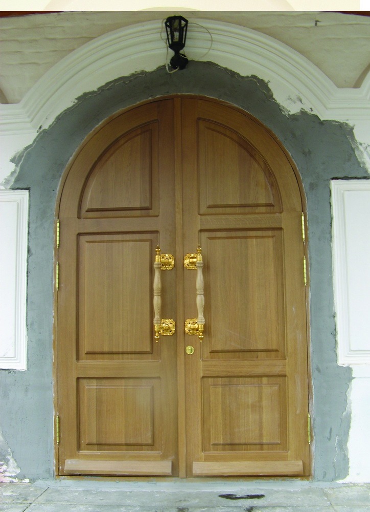 Дверь двухстворчатая. Размеры: 1200 х 2200 мм. Толщина: 40 мм. Ручка 540 мм. Материал: массив дуба, морилка, лак. Возможно изготовление по индивидуальным размерам.