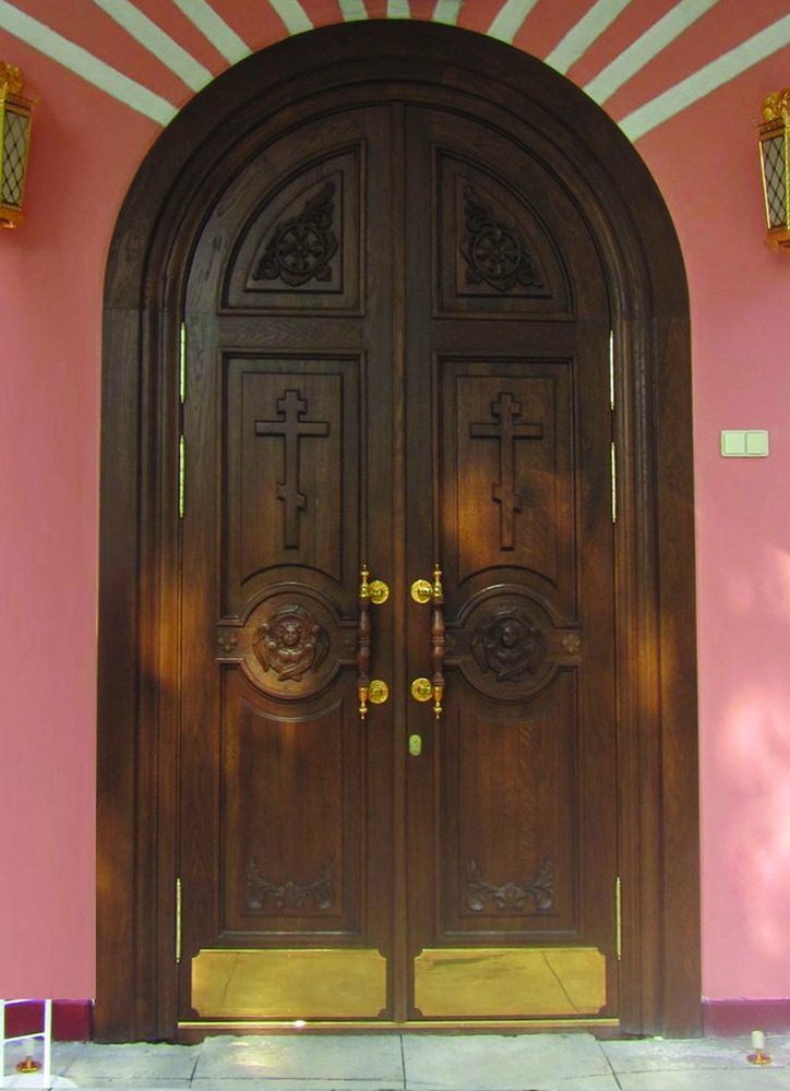 Дверь арочная двухстворчатая. Размеры: 1360 х 2840 мм. Ручки 540 мм. Наличник 100 мм. Материал: массив дуба. Накладки латунные. Возможно изготовление по индивидуальным размерам.