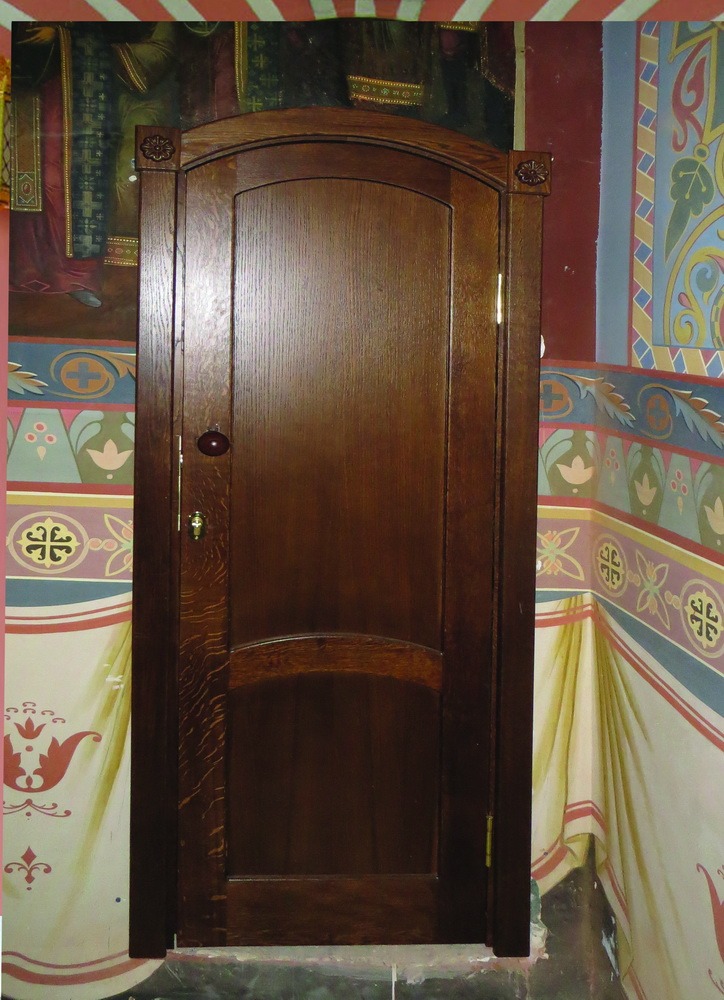 Дверь одностворчатая. Размеры: 600 х 1714 мм. Толщина 40 мм. Материал: массив дуба, морение, лак. Возможно изготовление по индивидуальным размерам.