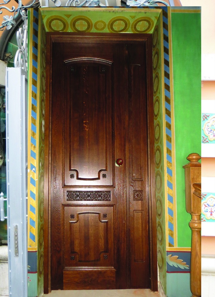 Дверь двухстворчатая, размеры: 1-я створка 620 х 2010 мм, 2-я створка 200 х 2010 мм, общий 820 х 2010 мм. Материал: массив дуба, морение, лак. Возможно изготовление по индивидуальным размерам.