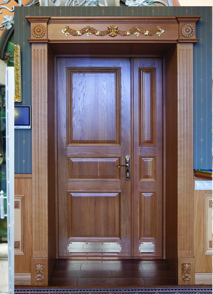 Дверь двухстворчатая. Размеры: 1-я створка 900х2040 мм, 2-я створка 300х2040 мм. Материал: массив дуба, морение, лак. Портал под заказ. Возможно изготовление по индивидуальным размерам.