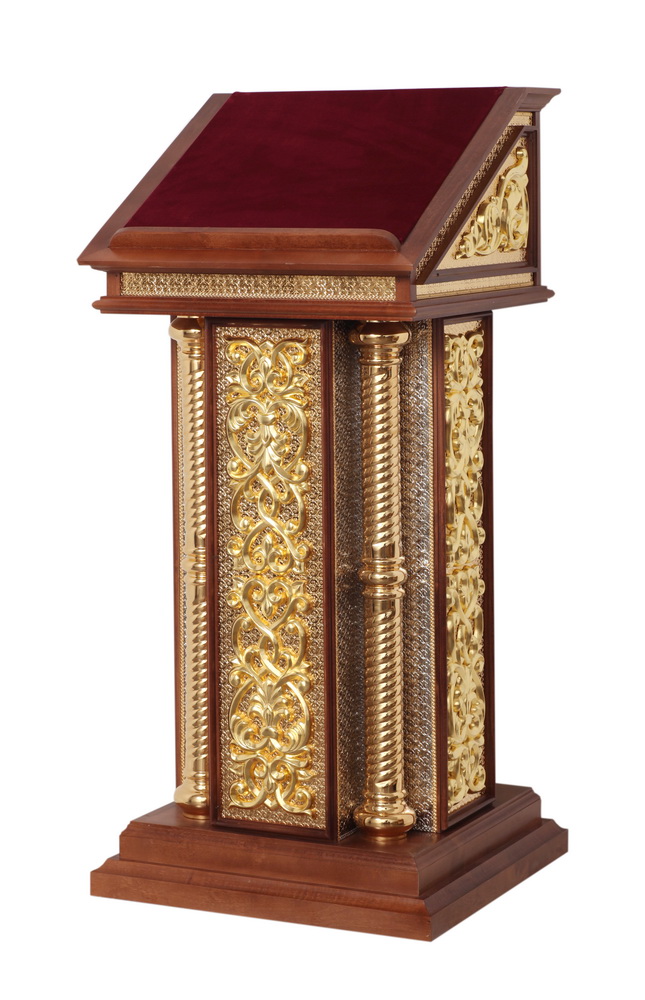 Тумбовый аналой из массива дерева, украшенный позолоченной резьбой, идеально подойдет на роль центрального аналоя. Высокий деревянный бортик и шершавое тканевое покрытие верха уберегут икону от скольжения и падения. Из-за необычной формы, напоминающей кафедру, данный аналой будет гармонично смотреться только храме с современным интерьером.