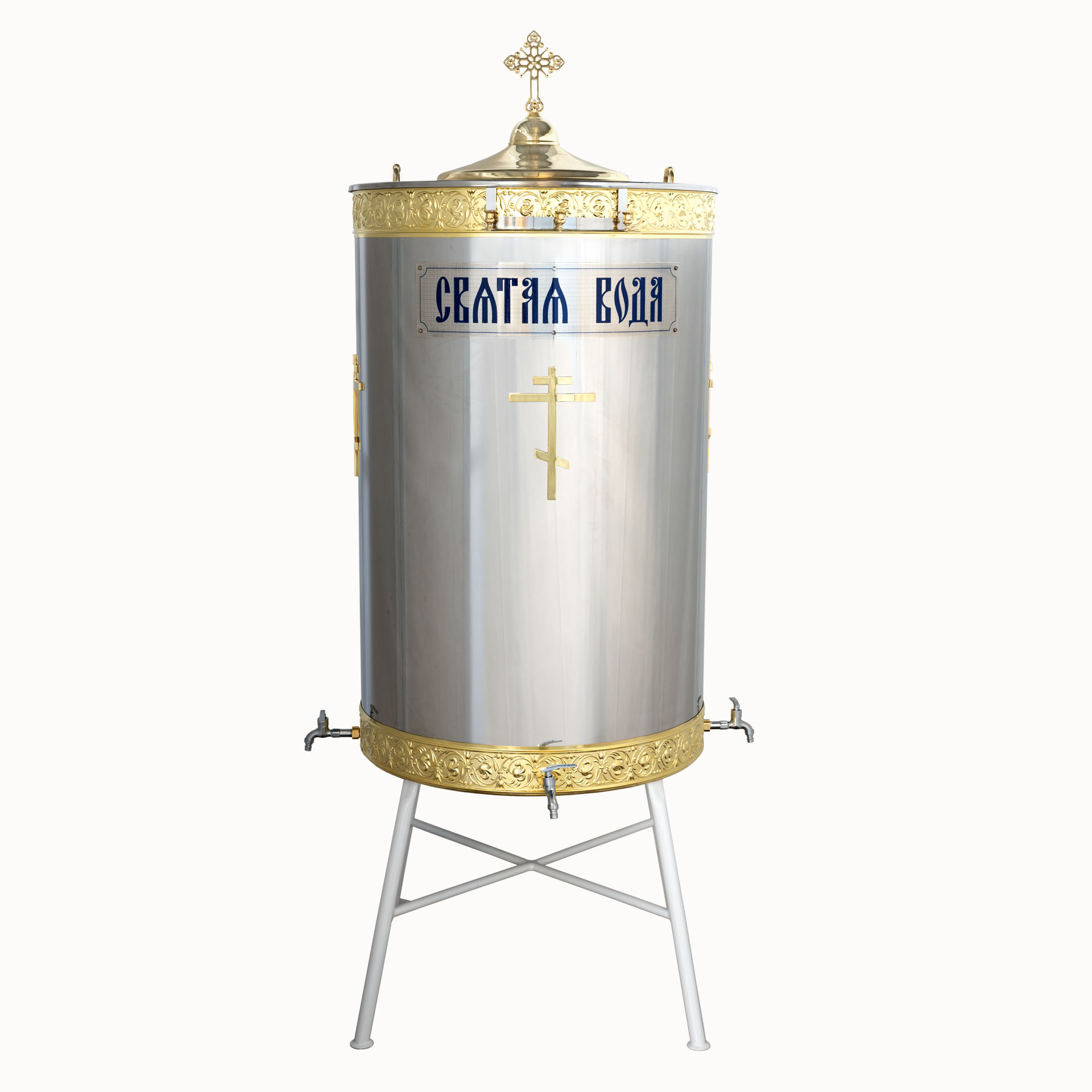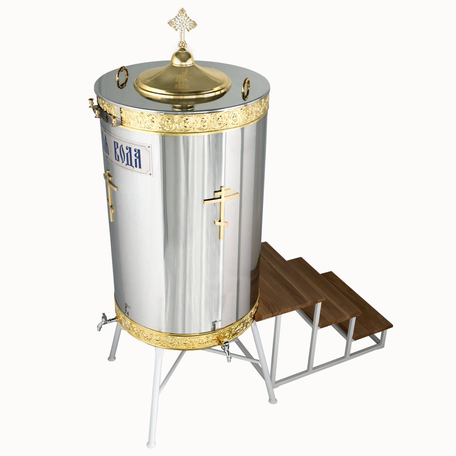 Данная модель водосвятного бака будет удобна для использования в день Крещения Господня. Благодаря трехступенчатой подставке священник любого роста сможет освятить крестом воду внутри бака, высота которого вместе с подставкой состовляет 2200 мм. Диаметр бака составляет 790 мм, высота – 1250 мм, а объем – 600 л. Вес бака - 38 кг Вес крышки - 6,2 кг, Вес подставки - 12,3 кг, Вес ступеней - 33,2 кг. Общий вес - 89,7 кг