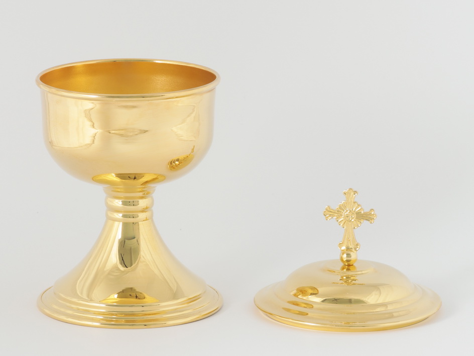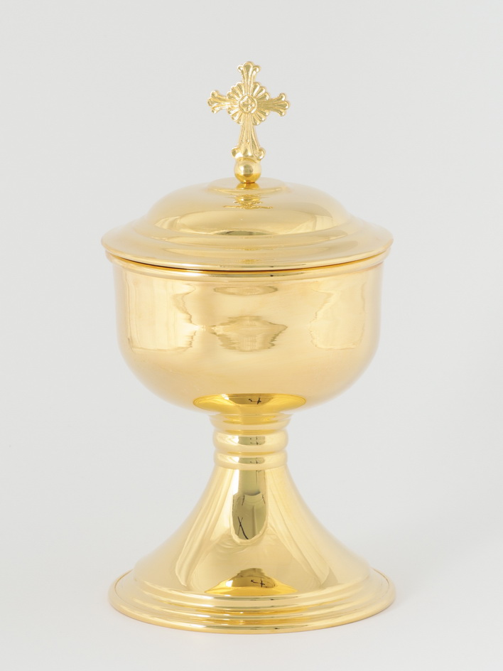 Универсальная чаша царственного золотого цвета впишется в интерьер любого храма. Ее крышка украшена крестом – символом победы Христа над смертью и диаволом. Сделаная из латуни, она обладает вместимостью до 0,5 л. Такого объема хватит даже для праздничной службы в храме среднего размера.