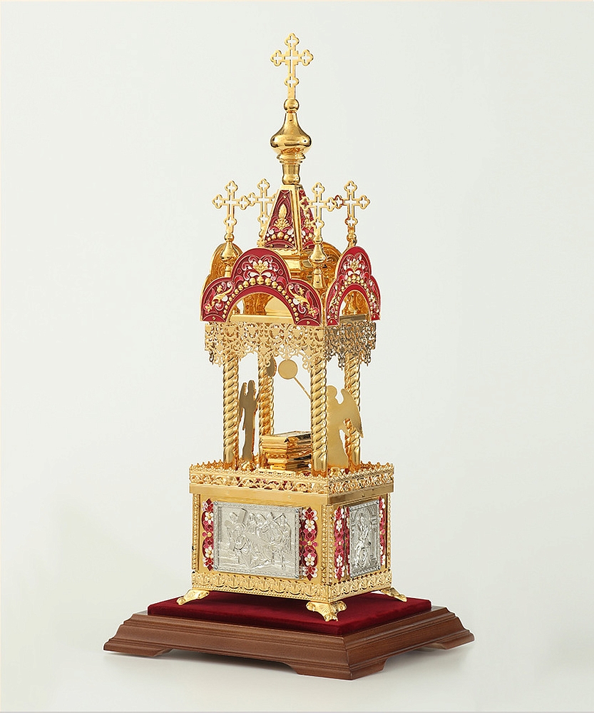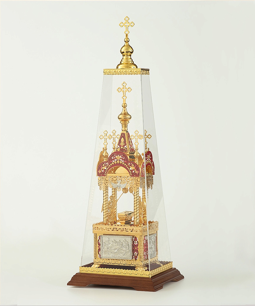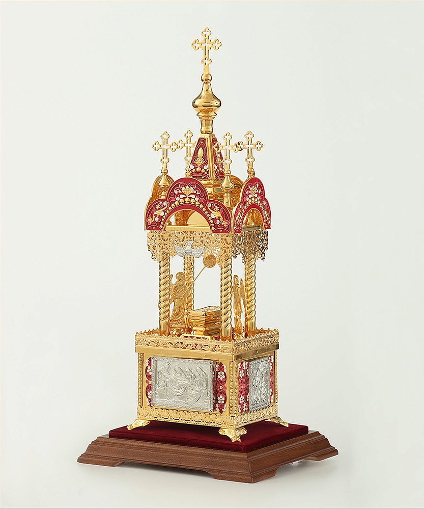 Богато украшенная дарохранительница, выполненная из латуни и меди, станет достойным местом для хранения Святых Даров. Дарохранительница сделана в форме часовни, увенчанной пятью крестами. Стены часовни украшены яркими геометрическими и растительными эмалевыми узорами, напоминающими о райском саде. Возле ящичка для Святых Даров стоят два ангела с рипидами в руках. Колпак из органического стекла защитит дарохранительницу от повреждений и пыли. Золотой цвет дарохранительницы красиво сочетается с ореховым цветом деревянной подставки, обитой бордовым бархатом. Цвет эмали может быть изменен по желанию заказчика.