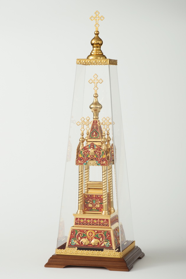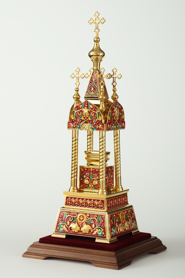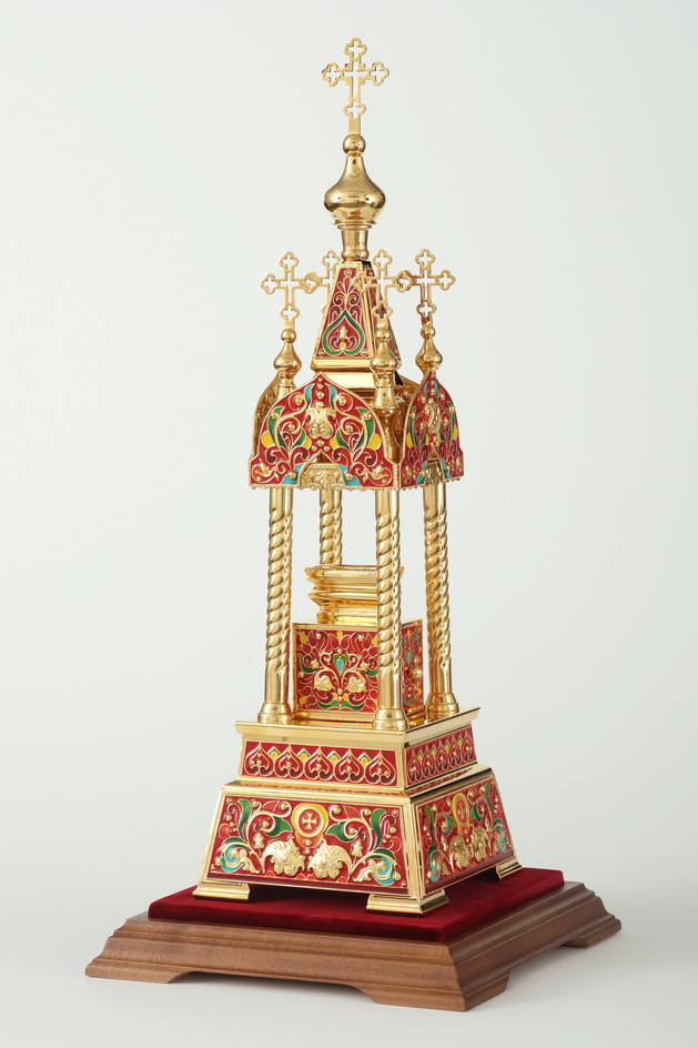 Необычная дарохранительница, выполненная из латуни и меди, станет достойным местом для хранения Святых Даров. Дарохранительница сделана в форме часовни, увенчанной пятью крестами. Стены часовни украшены яркими геометрическими и растительными эмалевыми узорами, напоминающими о райском саде. Колпак из органического стекла защитит дарохранительницу от повреждений и пыли. Золотой цвет дарохранительницы красиво сочетается с ореховым цветом деревянной подставки, обитой бордовым бархатом. Цвет эмали может быть изменен по желанию заказчика.