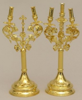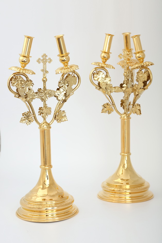 Особенностью изящного комплекта дикирия-трикирия является металлическая виноградная лоза, которая обвила подсвечники. Выполненные из латуни и покрытые позолотой, изделия украшены восьмиконечными крестами. Массивные основания диаметром 145 мм уберегут светильники от падений.