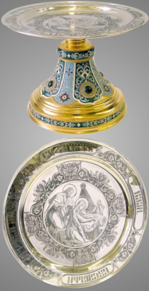 Дискос ручная гравировка / ф280мм / серебро, поддискосник медь / конус 2,0л потира / филигрань, эмаль / золочение / (УИН)