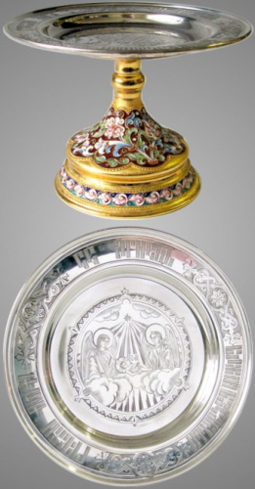 Дискос с поддискосником ручная гравировка, филигрань, эмаль, роспись / ф180мм-конус потира 0,3л / золочение / серебро (УИН)