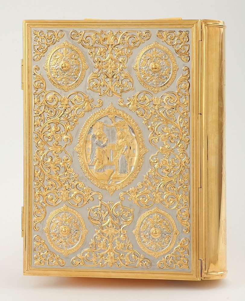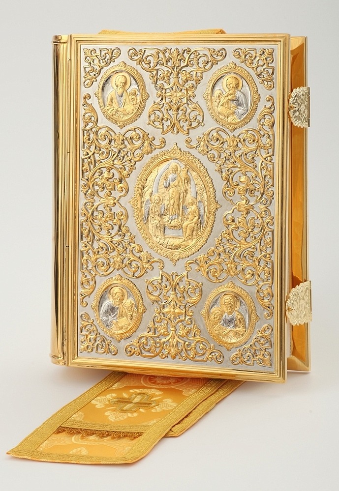 Текст Евангелия отпечатан в типографии ООО "ХПП" СОФРИНО"РПЦ" на церковно-славянском языке с указанием зачал. Данная книга дополняется закладкой из церковной ткани.