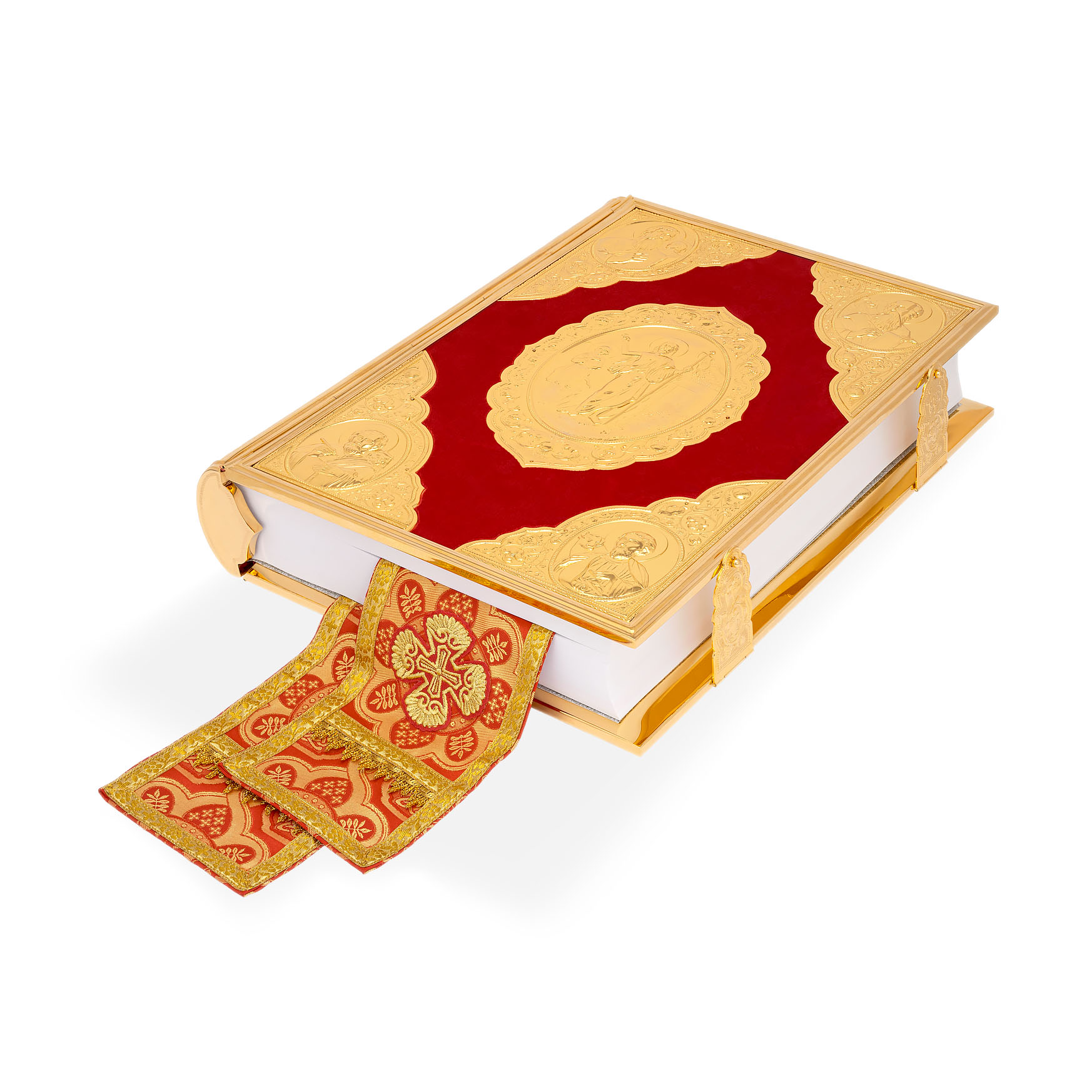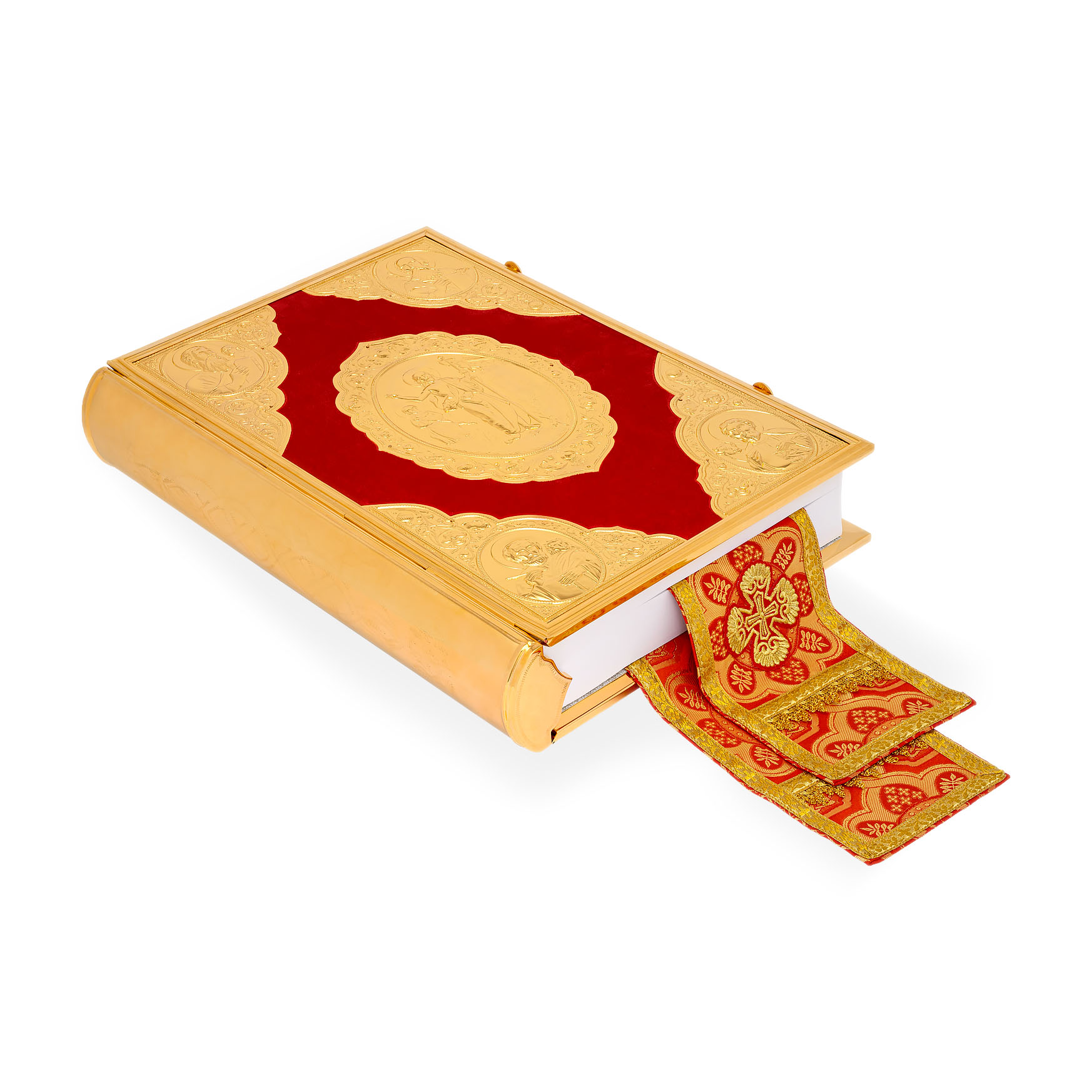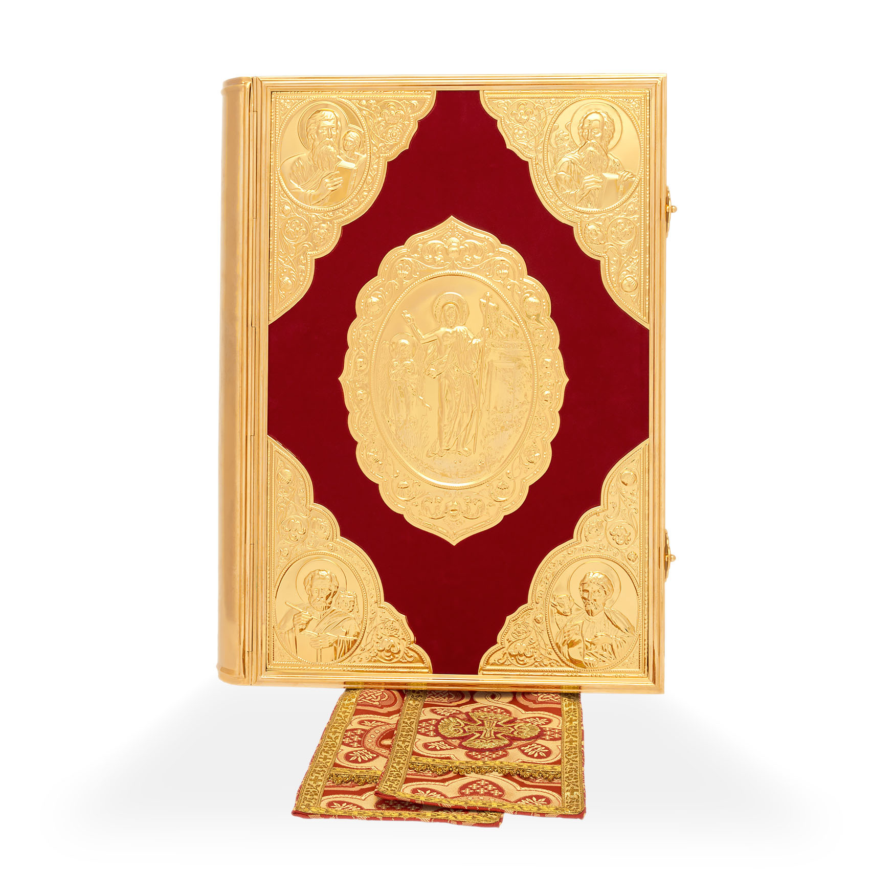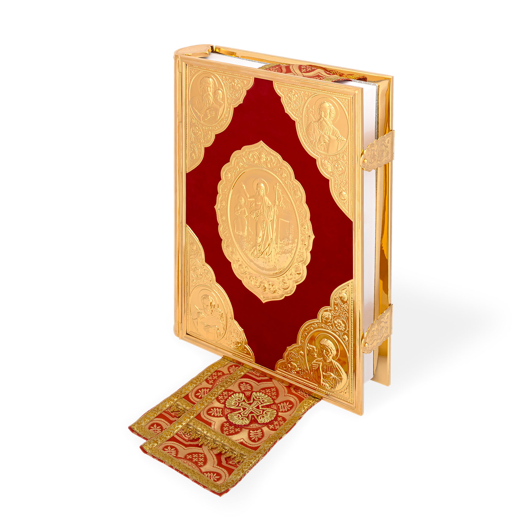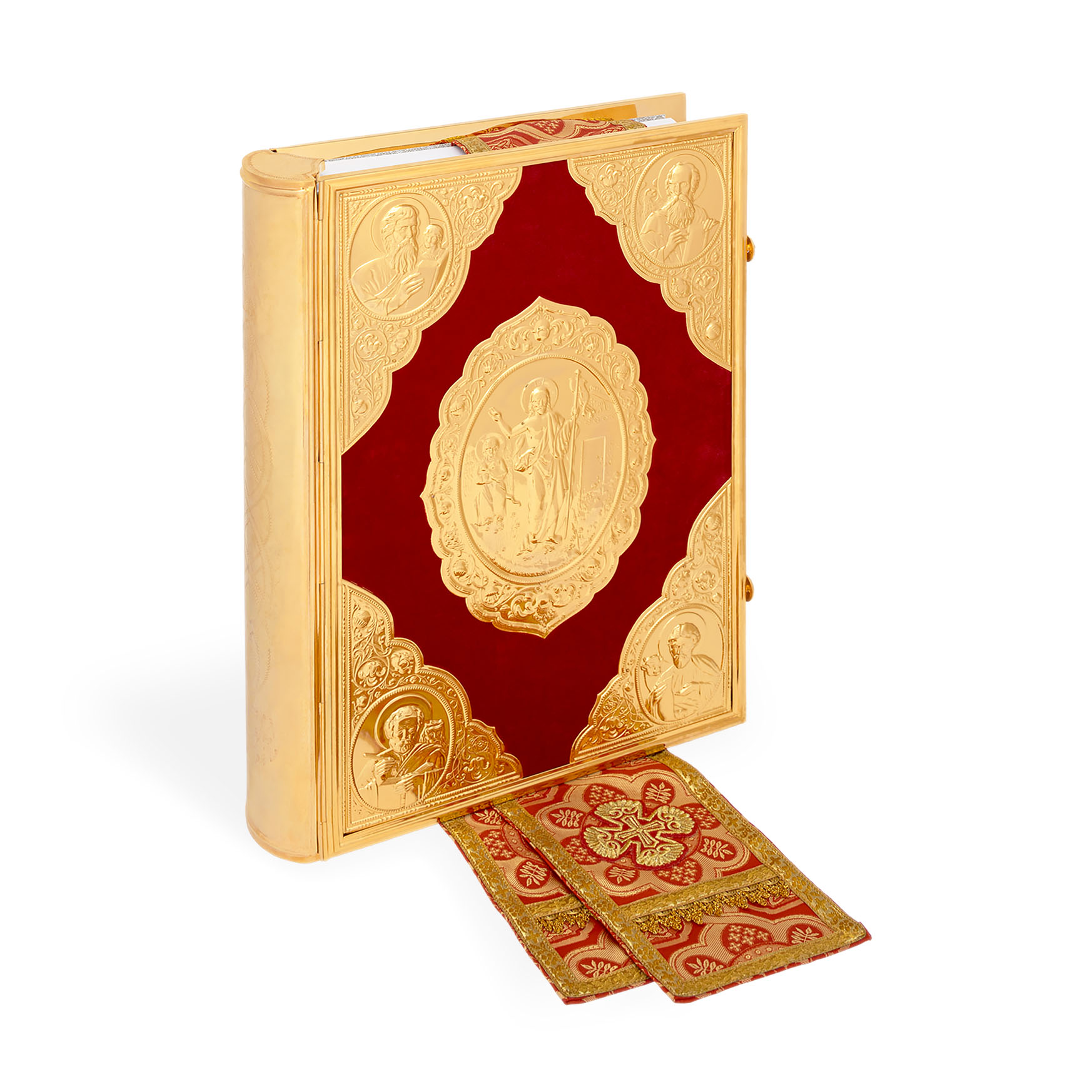 Текст Евангелия отпечатан в типографии ООО "ХПП" СОФРИНО"РПЦ" на церковно-славянском языке с указанием зачал. Данная книга дополняется закладкой из церковной ткани.