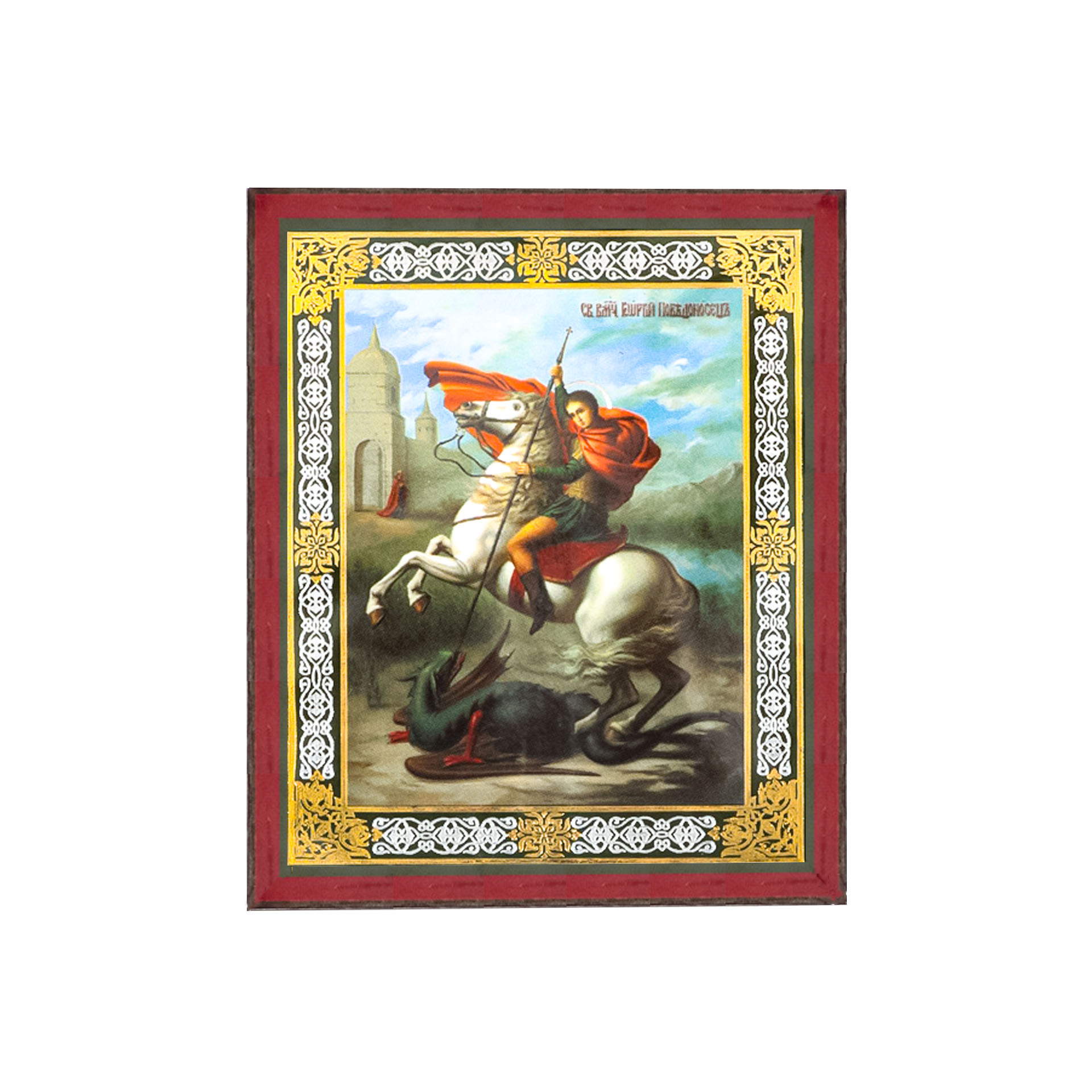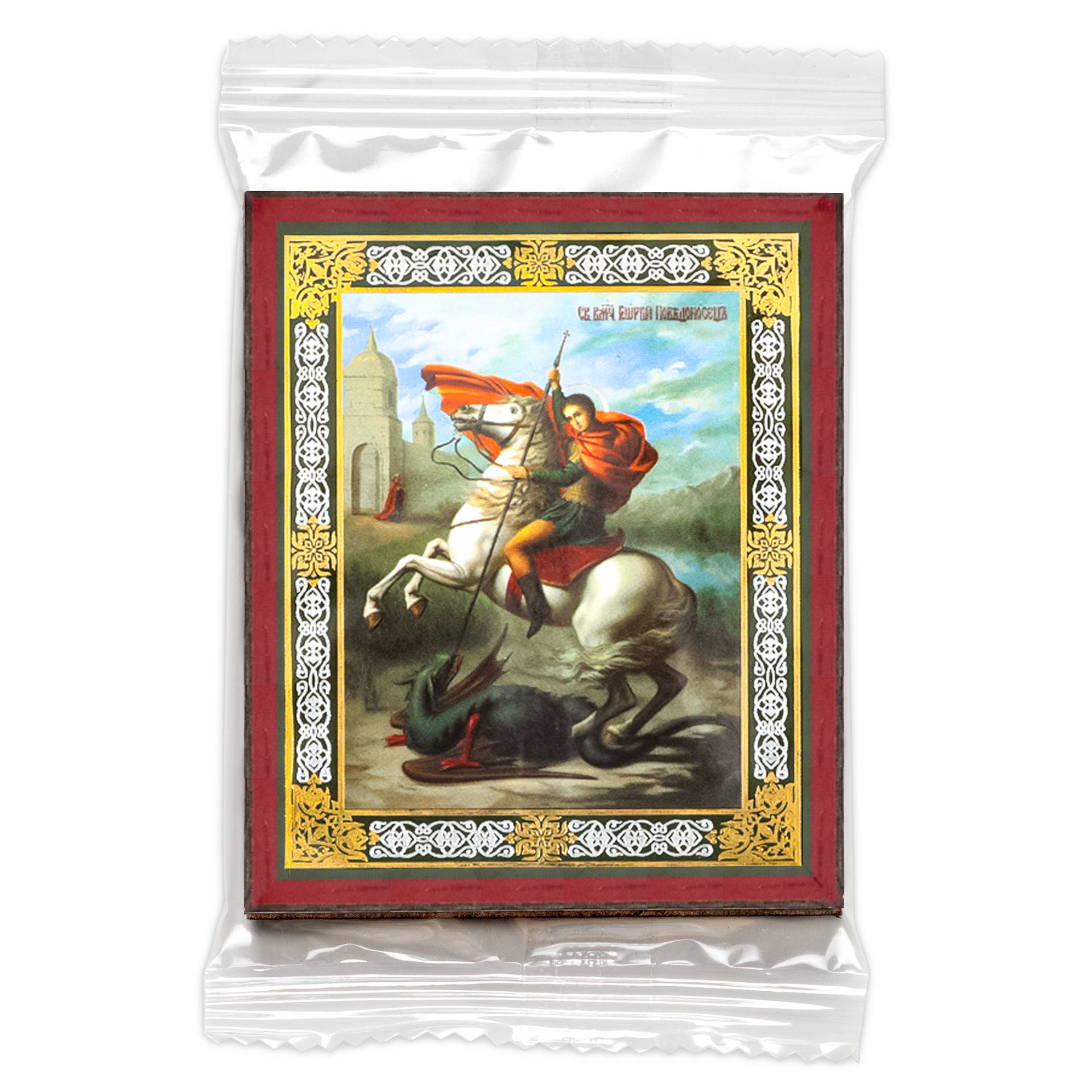 Икона на деревянном планшете 6х9 двойное тиснение, аннотация, упаковка Чудо Георгия о змие