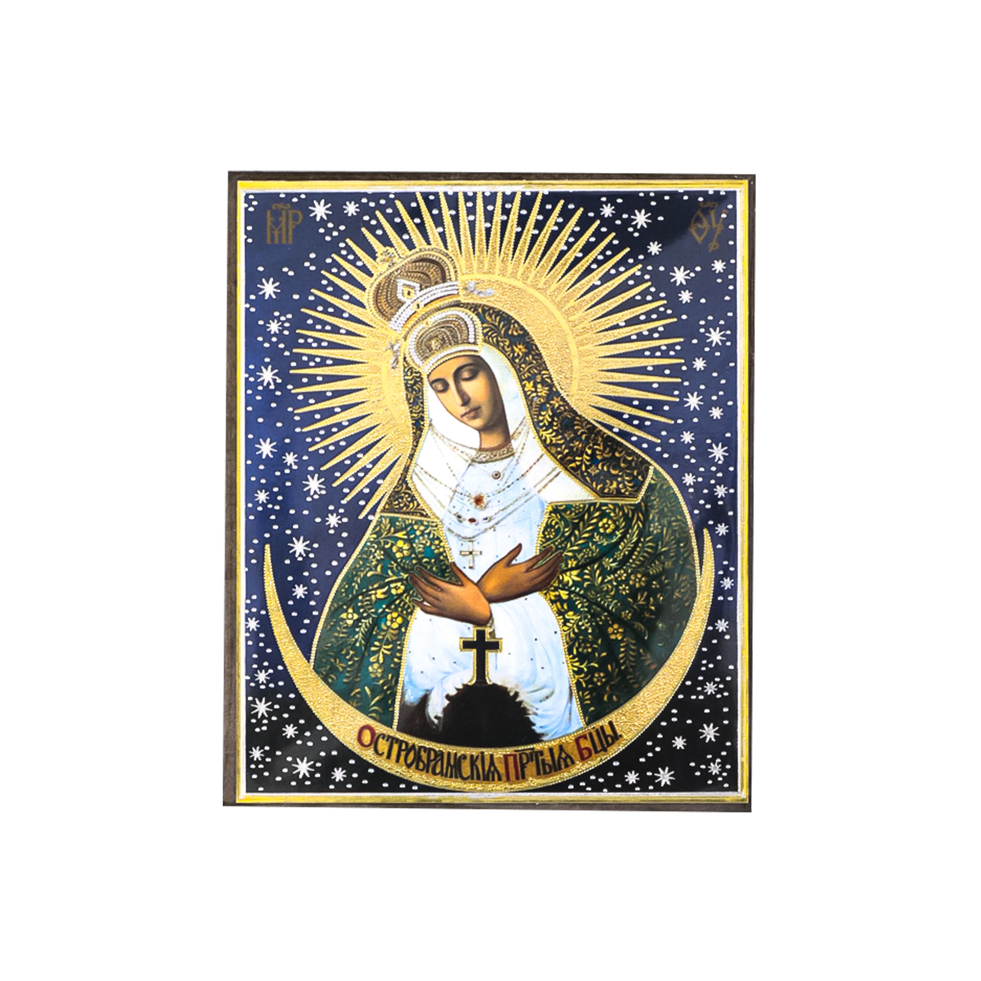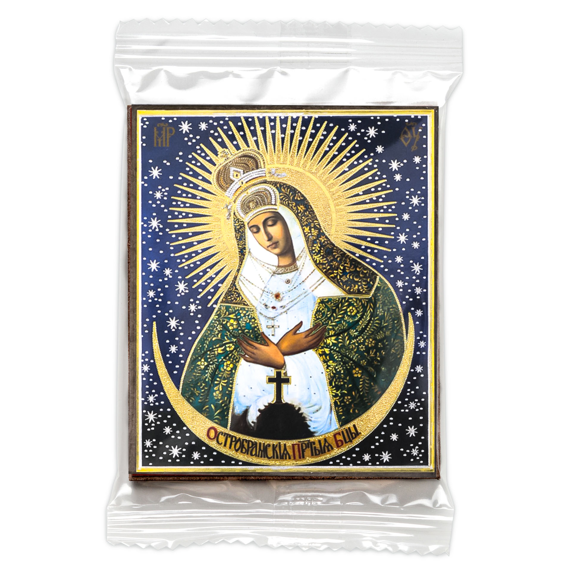 Икона на деревянном планшете 6х9 двойное тиснение, аннотация, упаковка Остробрамская БМ
