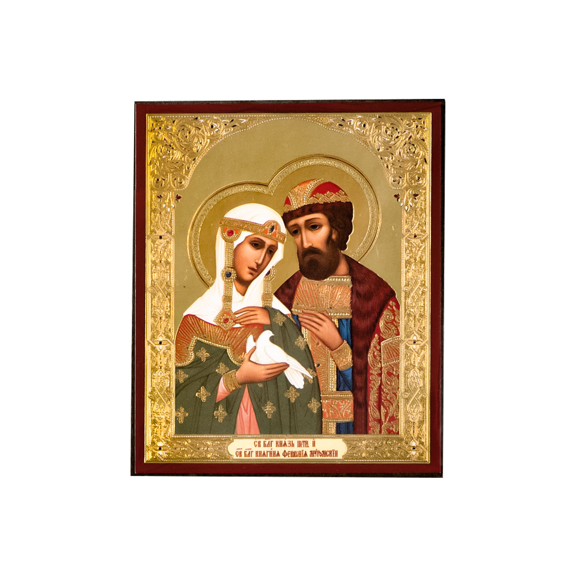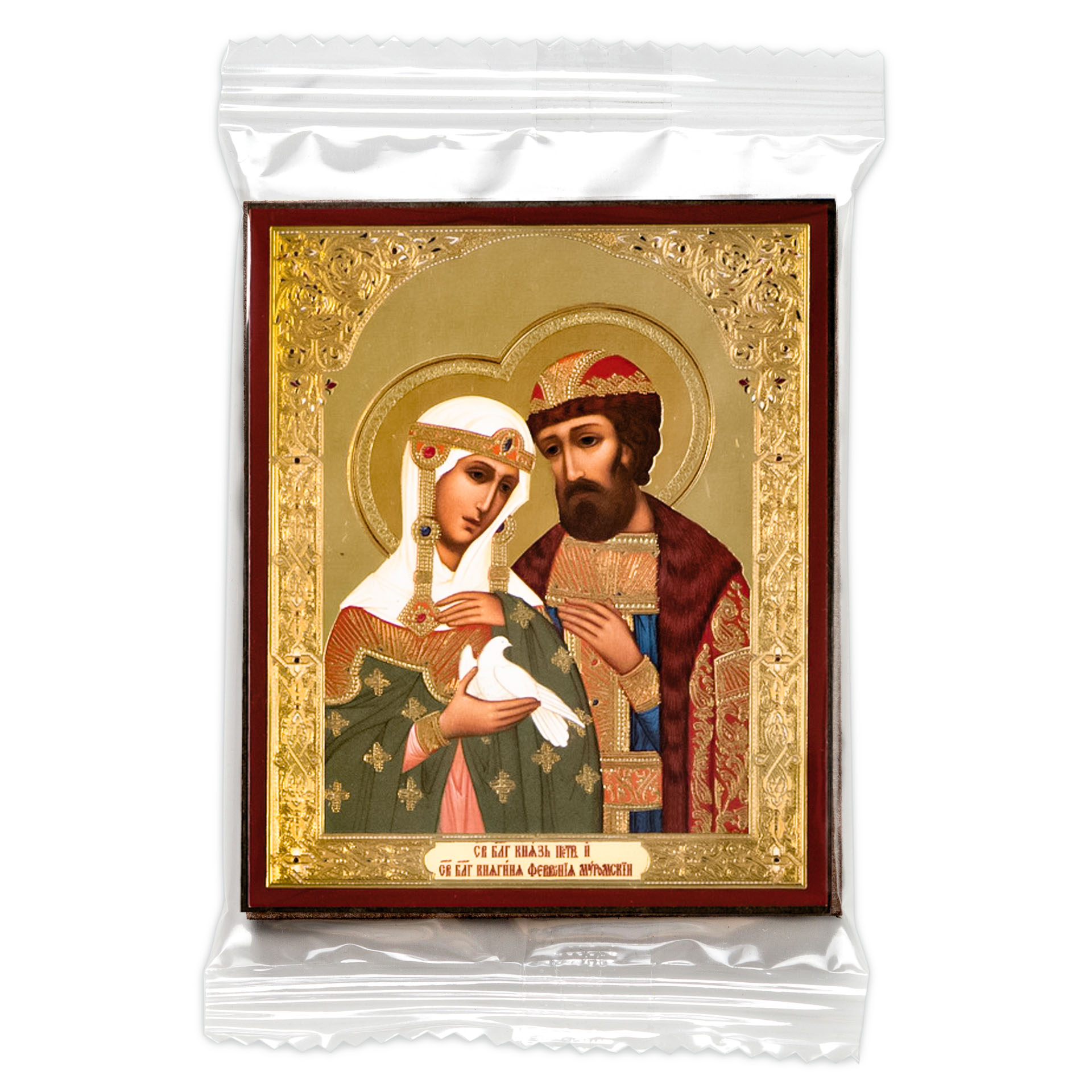 Икона на деревянном планшете 6х9 двойное тиснение, аннотация, упаковка Петр и Феврония 7