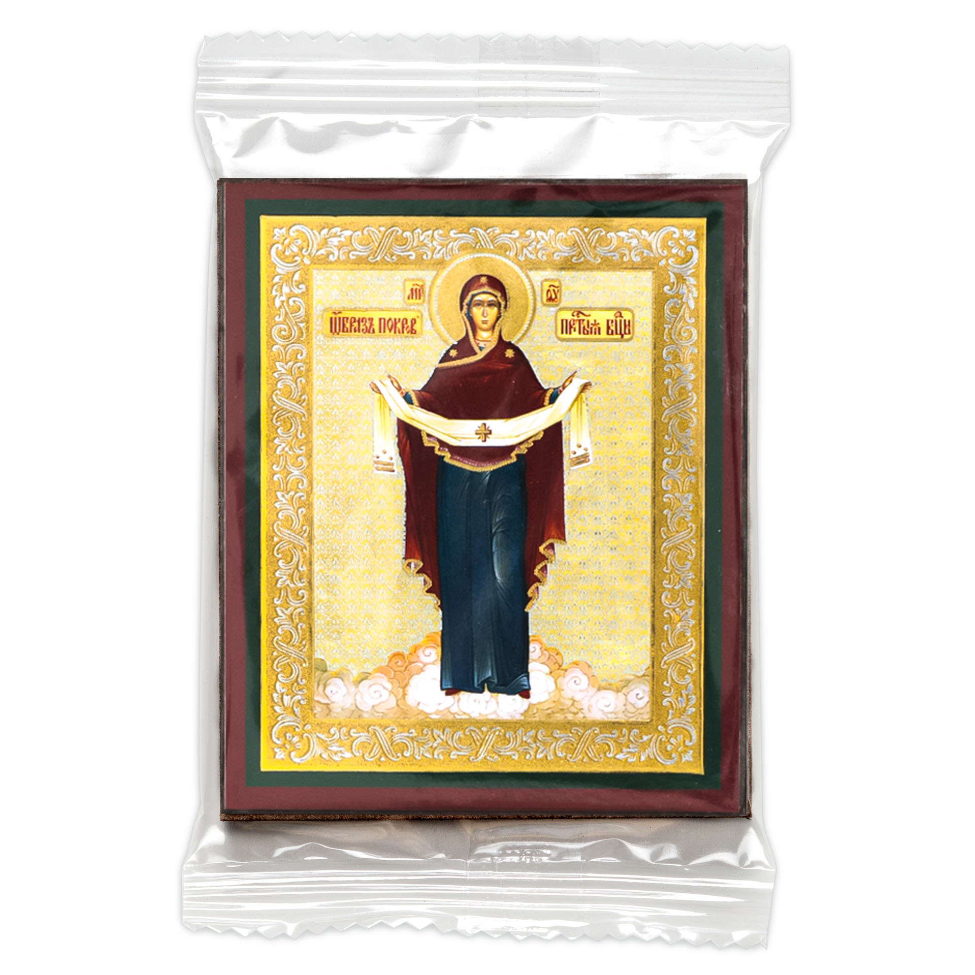 Икона на деревянном планшете 6х9 двойное тиснение, аннотация, упаковка Покров (ростовой)