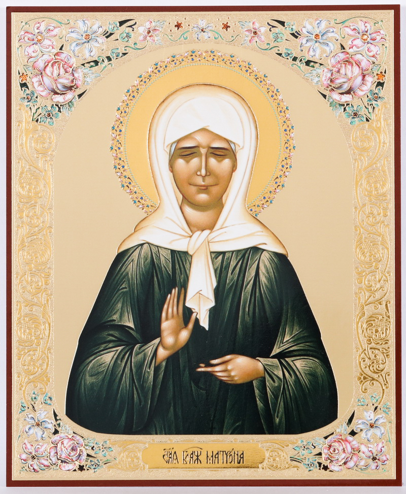 Икона на оргалите №1 11х13 двойное тиснение Матрона Московская (рамка с цветами)