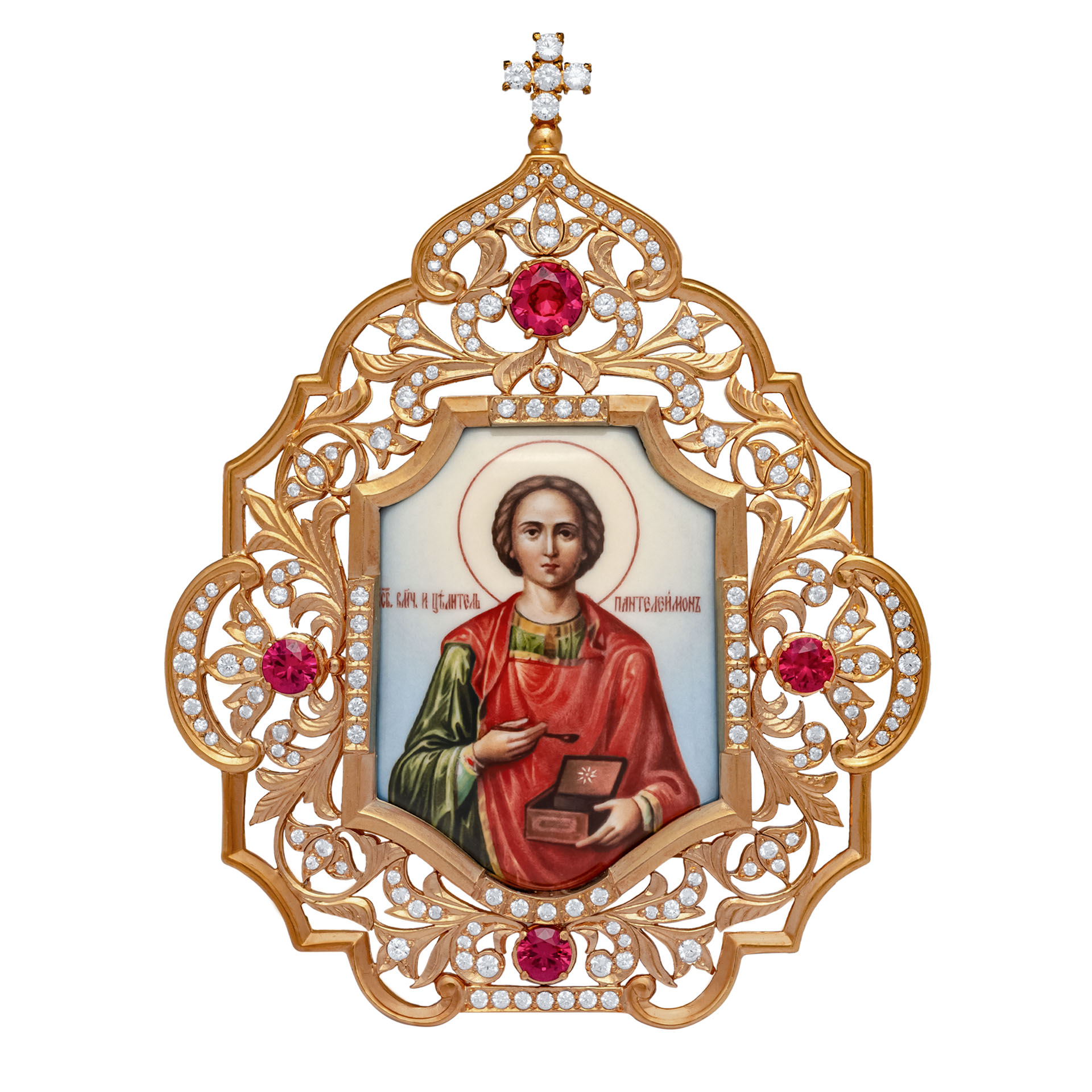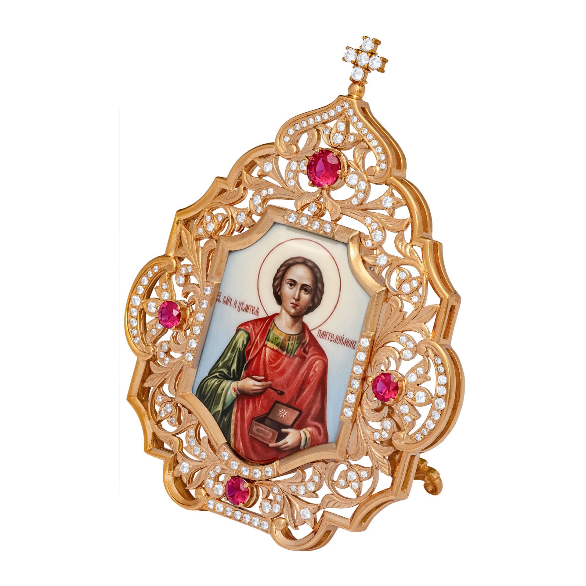 Икона настольная №152 / Фианиты серебро деколь / золочение / Пантелеимон (УИН)