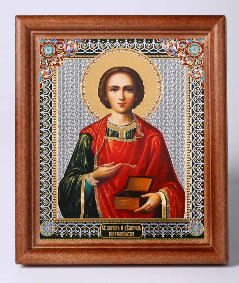 Икона в деревянной рамке 11х13 Набор с Днем Ангела, двойное тиснение Пантелеимон