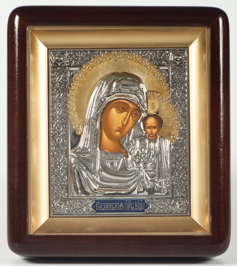 Икона в киоте 11х13 фигурный, темпера, риза, никель, эмаль Казанская БМ