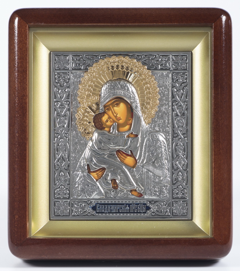 Икона в киоте 11х13 фигурный, темпера, риза, никель, эмаль Владимирская БМ