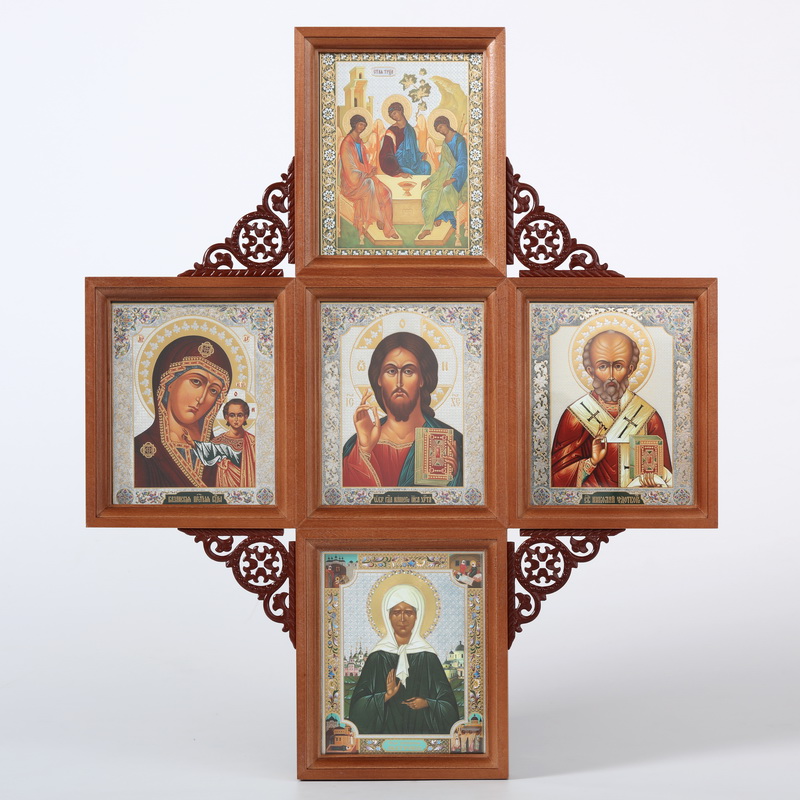 Икона в киоте 11х13 многоместная, двойное тиснение, 5 икон, резная Троица Спаситель Казанская Н.Чудотворец Матрона