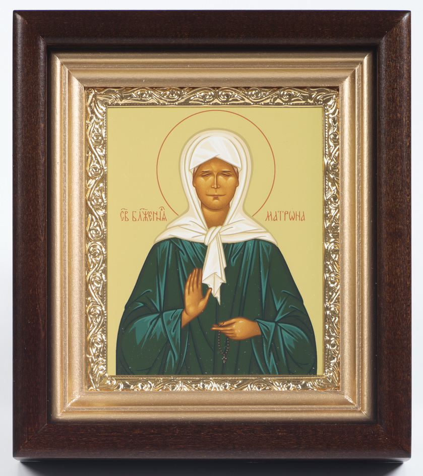 Икона в киоте 11х13 сложный, темпера, рамка золочёная Матрона