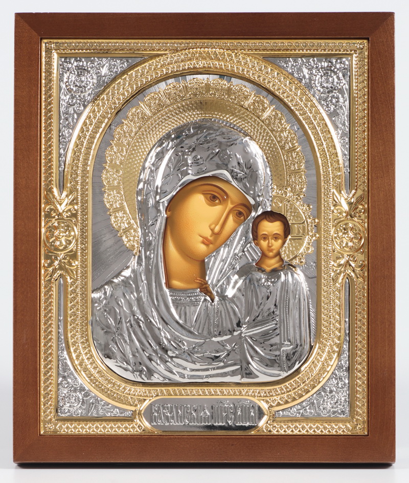Икона в киоте 18х24 фигурный №2 темпера, без подрамника, риза, никель, золочен Казанская БМ