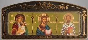 Икона в пластмассовой рамке 3х8,5 тройная с липкой лентой Казанская - Спаситель - Николай Чудотворец