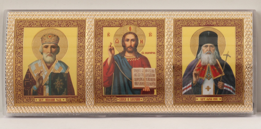Икона в пластмассовой рамке 5,5х13 тройная с липкой лентой Николай Чудотворец - Спаситель - Лука Крымский 2