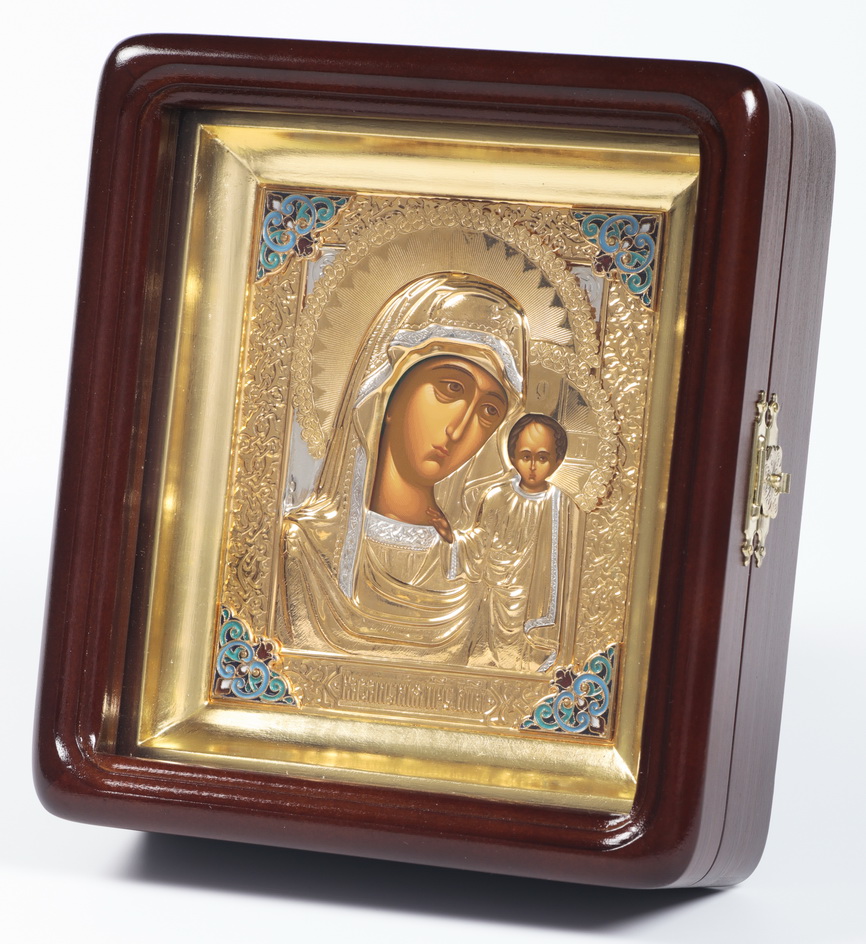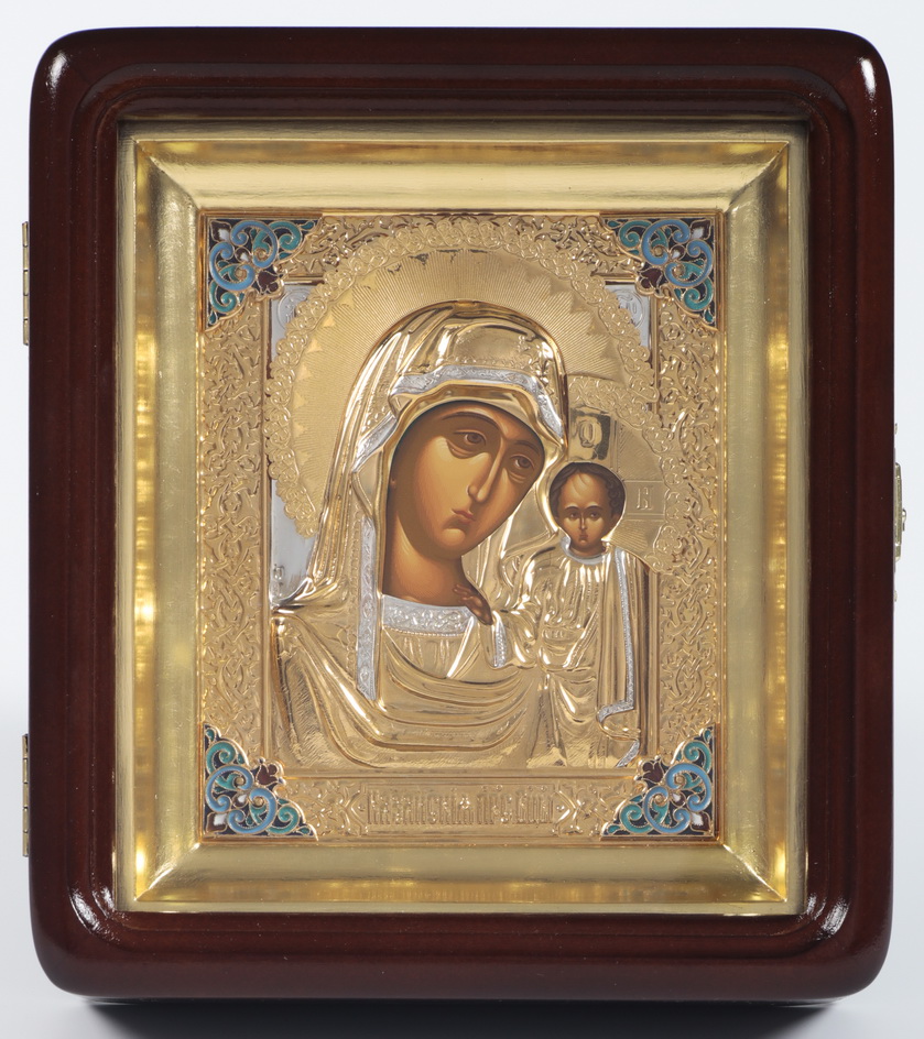 Икона в штампованном окладе 11*13 серебро эмаль на углах / киот / золочение / Казанская БМ (УИН)