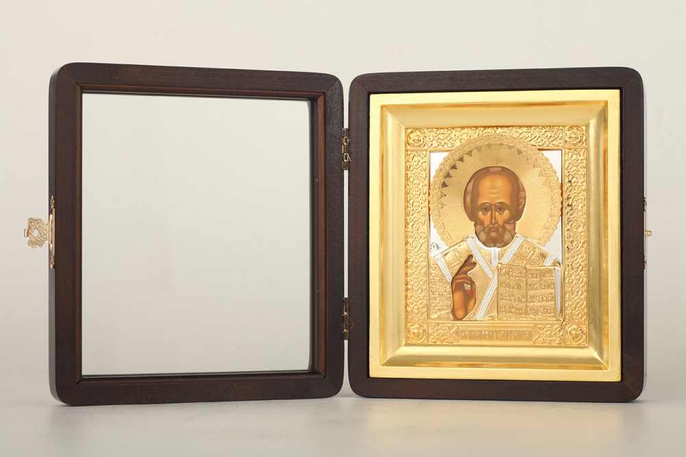 Икона в штампованном окладе 11*13 серебро / киот / золочение / Николай Чудотворец (УИН)