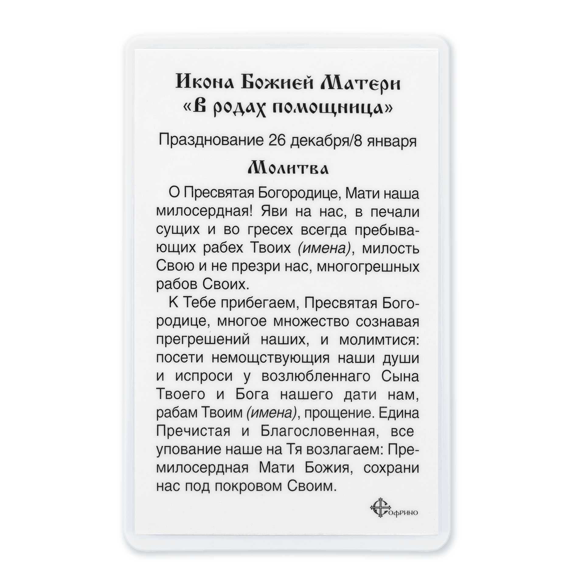 Икона в жесткой ламинации 5х8 с оборотом Помощница в родах