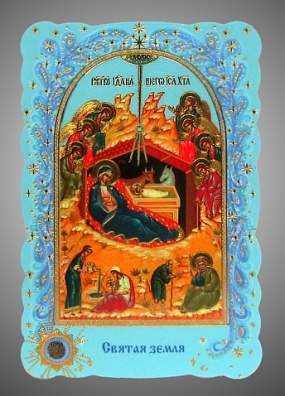 Икона в жесткой ламинации 8х11 с оборотом, тиснение, высечка, частица земли Рождество Христово 37