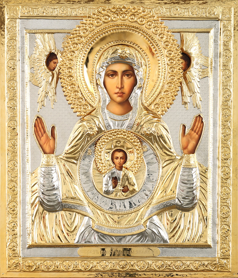Риза изготавливается методом гальванопластики, из-за определенного техпроцесса все габариты и вес изделия могут отличаться. Икона написана на МДФ, которая покрыта левкасом. Риза изготовлена из меди, покрыта никелем и гальваническим золотом (комбинированное золочение). Тыльная сторона ризы обтянута бархатом. По желанию заказчика ризу можно сделать полностью золоченой или полностью покрытой никелем.