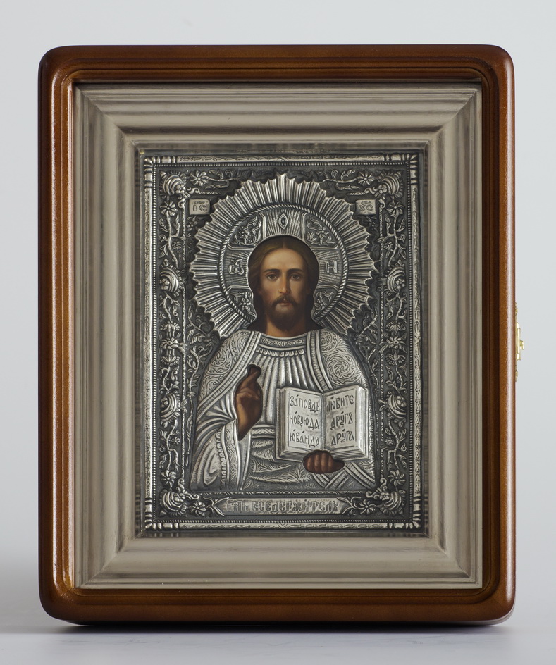 Икона живописная в киоте 18х24 масло, риза №233, черненое серебрение, киот №1 Спаситель