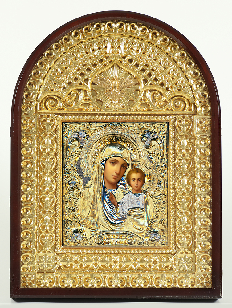 Риза изготавливается методом гальванопластики. В связи с техпроцессом габариты и вес изделия могут отличаться. Икона написана на МДФ покрытой левкасом. Риза изготовлена из меди, покрыта никелем и гальваническим золотом (комбинированное золочение).