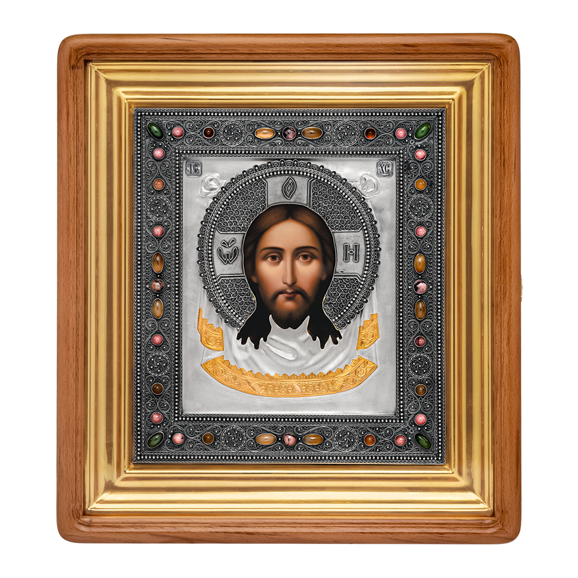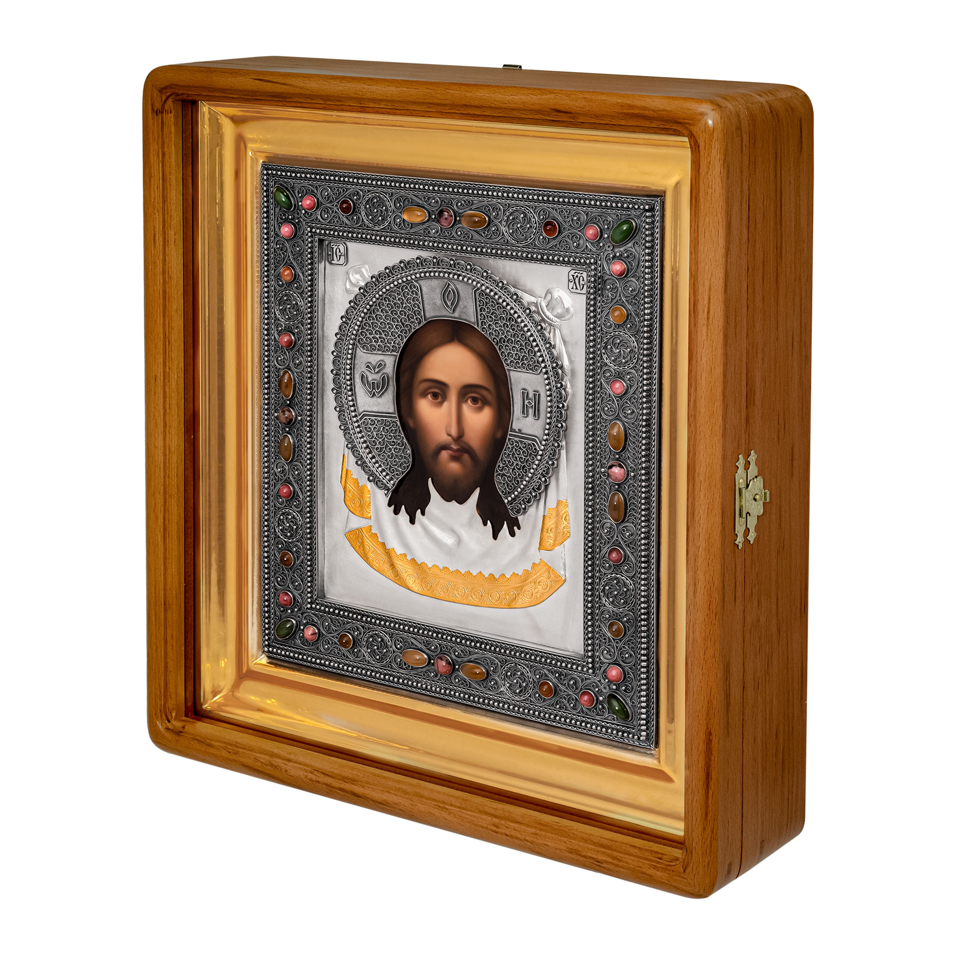 Икона живописная в серебряном окладе 30*40 / киот / УИН Спас Нерукотворный