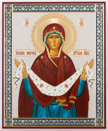 Икона на оргалите №1 11х22 двойное тиснение Покров (ростовой) 2