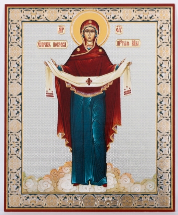 Икона на деревянном планшете 11х13 двойное тиснение Покров (ростовой)