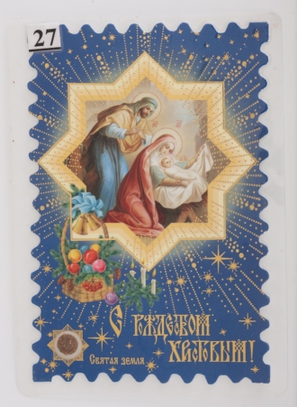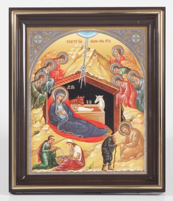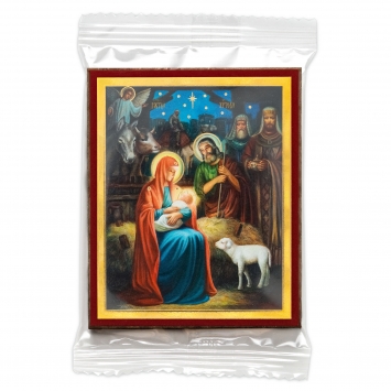 Икона в жесткой ламинации 8х11 с оборотом, тиснение, высечка, частица земли Рождество Христово 27