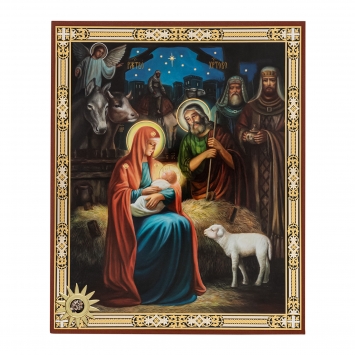 Икона на доске 33х40 золоченое покрытие, объёмная печать, лак Рождество Христово