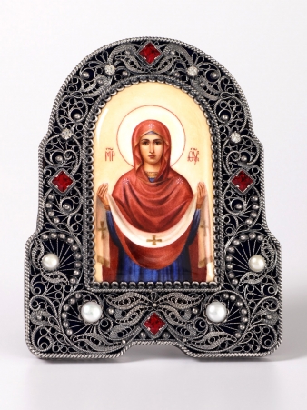 Икона именная №48 финифть филигрань, в деревянной рамке серебро Покров (УИН)