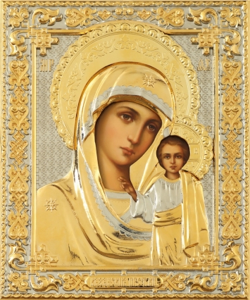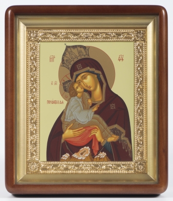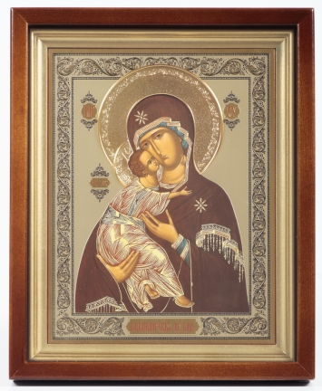 Икона в киоте 22х26 сложный, тройное тиснение, венчик золоченый Владимирская БМ