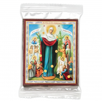 Икона на деревянном планшете 6х9 двойное тиснение, аннотация, упаковка Всех скорбящих Радость с грошиками №3