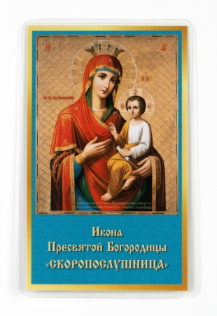 Икона в жесткой ламинации 5х8 с оборотом Скоропослушница БМ