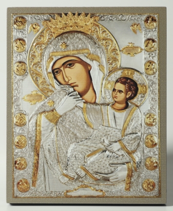 Икона в жесткой ламинации 8х11 с оборотом, двойное тиснение, высечка Млекопитательница БМ