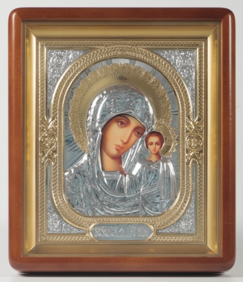 Икона в киоте 18х24 фигурный, темпера №8, риза-рамка объемная, открытая, золочёная, никелирование Казанская БМ 1