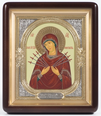 Икона в киоте 18х24 фигурный, темпера, венчик, риза-рамка объемная, открытая, золочение Семистрельная БМ