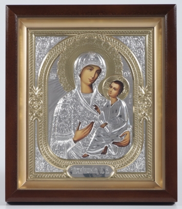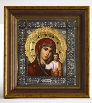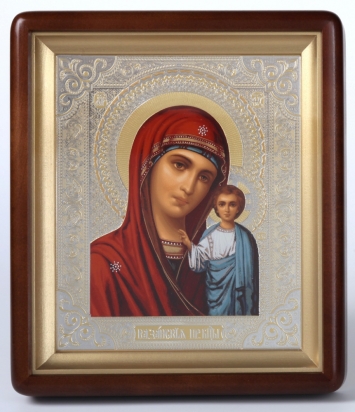 Икона в киоте 18х24 фигурный, темпера №8, риза-рамка объемная, открытая, золочёная, никелирование Владимирская БМ